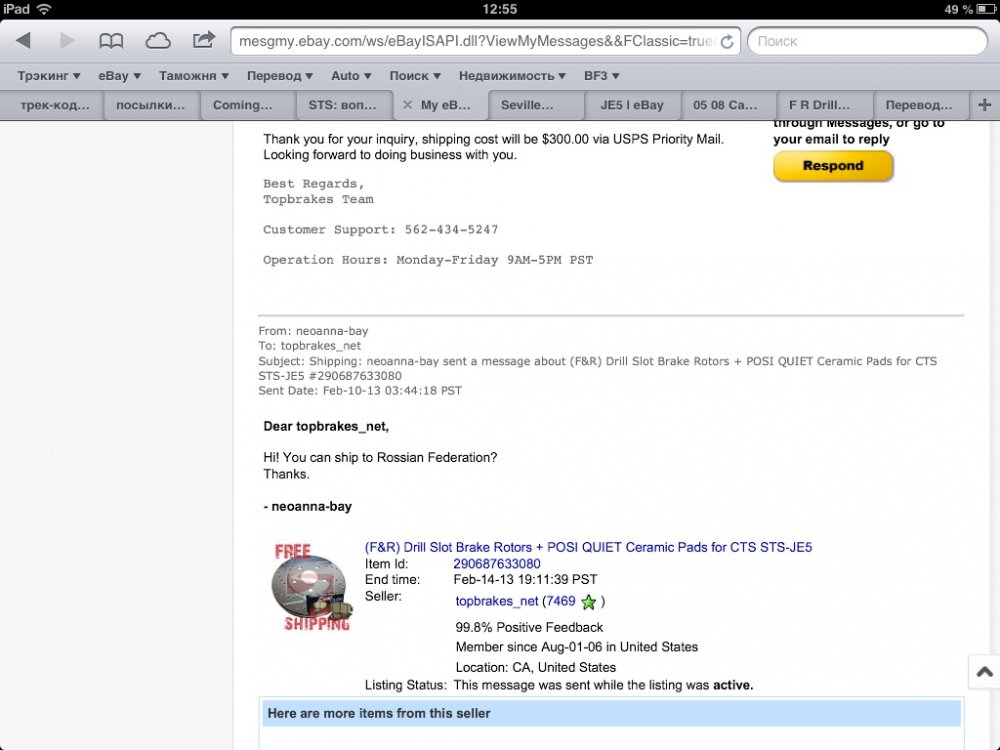 Вот магазин на eBay - они только CQUENCE продают. Если будете общаться, то торг уместен. http://stores.ebay.com/Cquence-Brake-Rotors/_i.html?_nkw=Sts&submit=Search&_sid=44187710 FREE shipping исключительно по штатам. Посылка standard USPS 250-300. Доставка естественно не самолетом