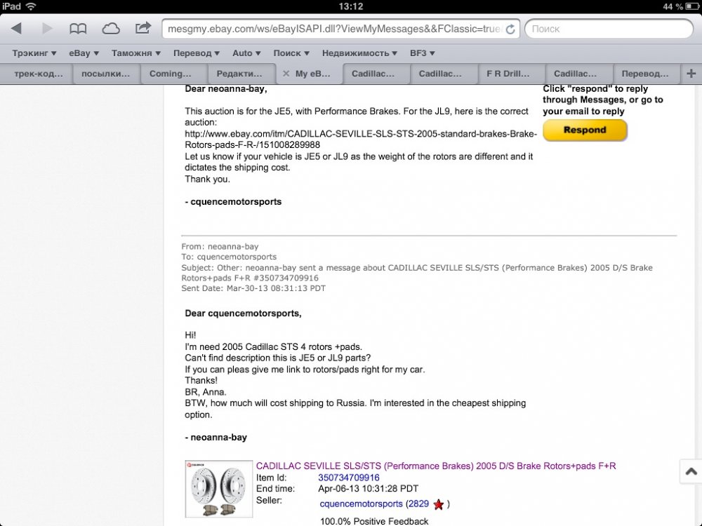 EZ Sport http://www.ebay.com/itm/Cadillac-STS-JE5-05-08-Drill-Slot-Rotors-Pad-Set-F-R-/360643730815?pt=Motors_Car_Truck_Parts_Accessories&fits=Make%3ACadillac&hash=item53f80a9d7f&vxp=mtr PosuQiuet http://www.ebay.com/itm/05-08-Cadillac-STS-JE5-12-72-F-R-ROTORS-BRAKE-PADS-/370796012200?pt=Motors_Car_Truck_Parts_Accessories&fits=Make%3ACadillac&hash=item56552a22a8&vxp=mtr Сейчас посмотрел - свои брал за 290 плюс 300 доставка. Итого $600. С колодками. Извинюсь за дезинформацию. Эти выходят дешевле, учитывая, что доставка USPS Priority mail, a не Standart intl shipping. У меня Standart intl shipping. Может поэтому и цена такая.