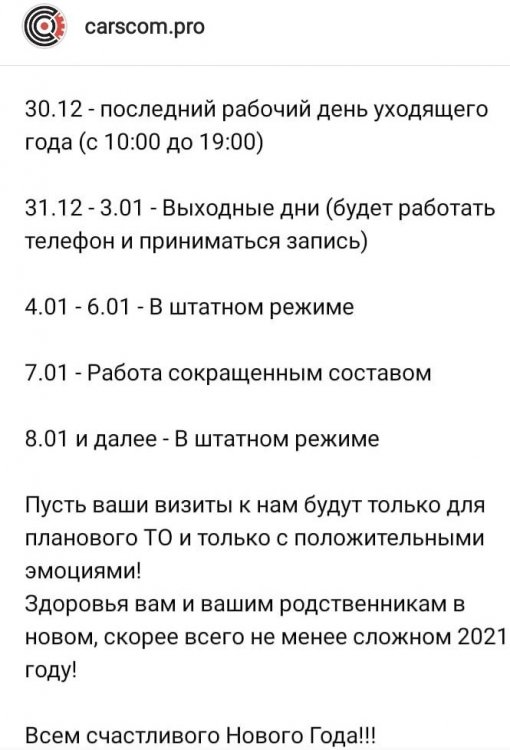 Хотим сообщить, что на период самоизоляции, наш автосервис продолжает работать! Так как мы обслуживаем часть общественного транспорта, то с натяжкой, мы можем продолжать работать пока что-то не изменится. Персонал пришлось сильно сократить на этот период, поэтому возможны некоторые технические сбои, но все решается звонком на мой номер 8926-100-2788, 7 дней в неделю с 10 до 3х часов ночи, можно писать и звонить, решать спорные вопросы если возникают, записываться на ремонт, заказывать запчасти новые и б/у. Так-же запись на сервис по телефону 8919-100-1616 Дмитрий. Действует ряд ограничений: - дистанция 1.5 метра - доступ в рем. зону ограничен - прием и выдача за воротами тех. центра - согласование деталей по телефону, или любыми месенджерами - так-же после согласования с клиентом, возможны варианты забора и доставки авто, эвакуатором, или перегоном своим ходом, без вашего участия. -