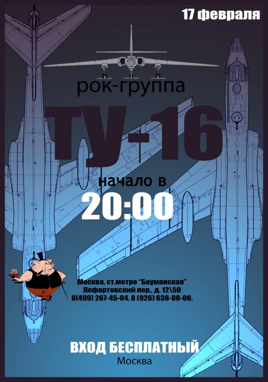 3 мая состоится очередной концерт группы ТУ-16 в клубе Швайн, Лефортовский переулок 12. Начало в 20.00. Вход свободный. м.Бауманская, от метро недалеко, в клубе пиво и др.более крепкие напитки. Группа существует с 1978 года. Приглашаю всех одноклубников и их друзей. Я участник и руководитель группы, автор всех композиций.