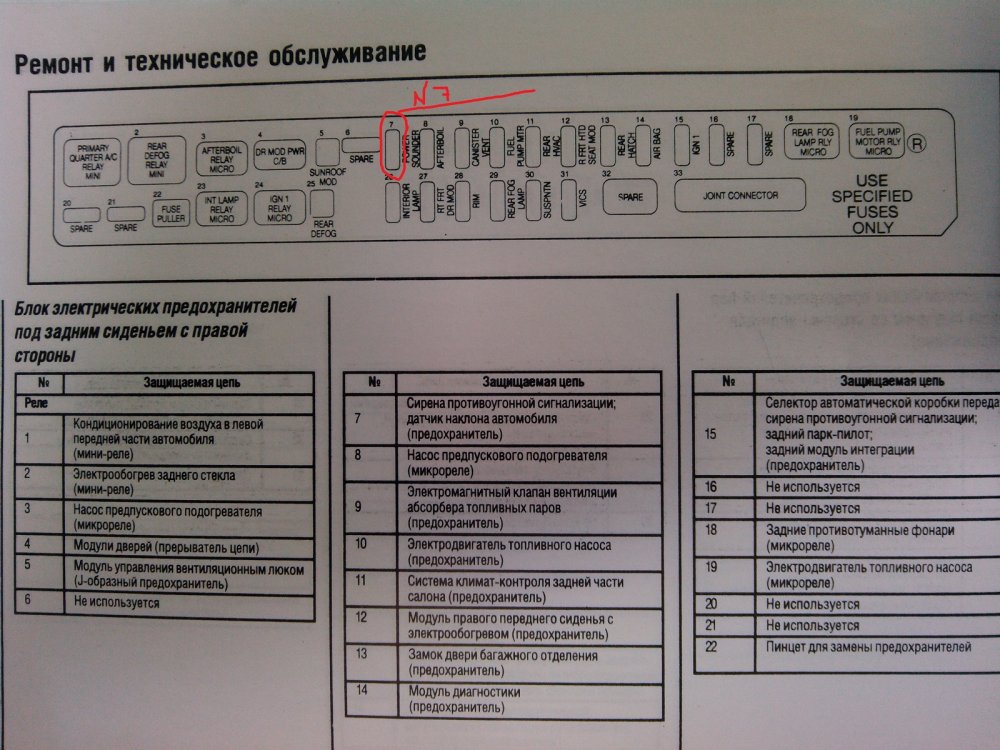 я вернусь в москву только 14-го числа.. тогда сфотографирую и отправлю правый блок предохранитель №7 Предохранитель сигнализации. если нет мануала могу сфотографировать на месте. Залез в блок предохранителей перед правым задним сиденьем - там нет номеров и я не понял который седьмой. Это который VICS что ли? Если не сложно, можно узнать аббревиатуру предоха? На американском форуме мне ответили, что эта хрень есть только на экспортных машинах (как наши) и сходит с ума, когда в ней садится автономная батарейка, которую нельзя поменять.....