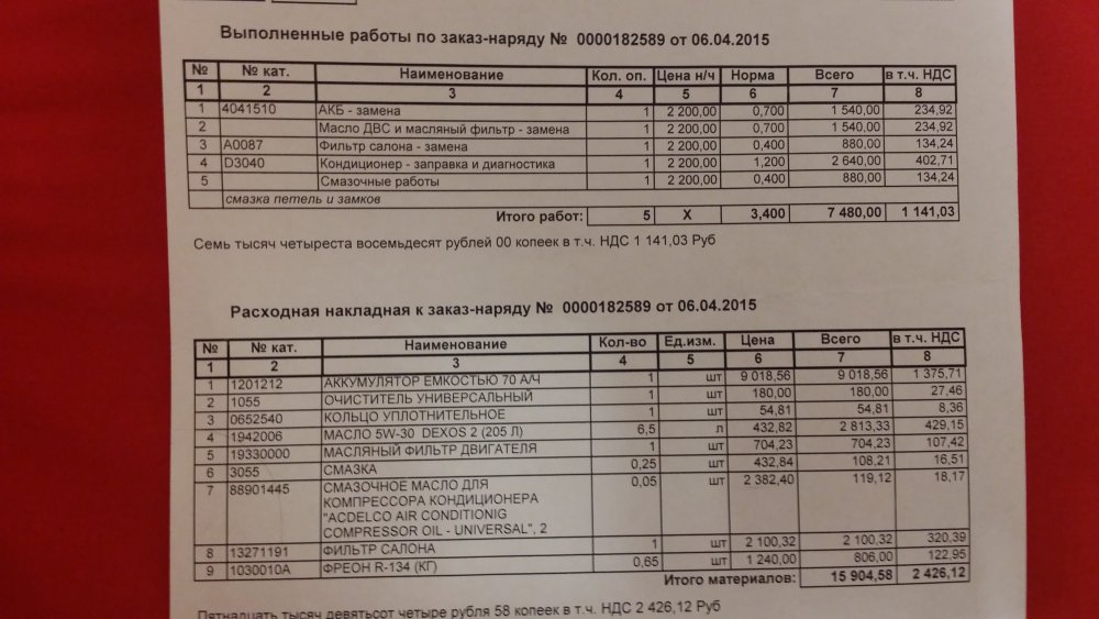 Нашел наряд на работы. Со "всеми" жидкостями я приврал. Только масло в двигателе и кондиционер обслужили. Может и хорошо, что "криворучки" не лезли в дифференциал. Выходит надо будет антифриз и тормозную жижу тоже обновить. Приложу накладную, вдруг кому ценник будет интересен.