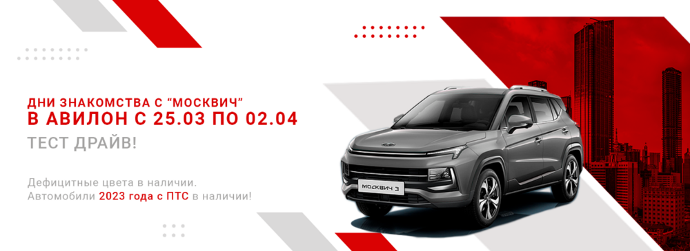 Дни знакомства с «Москвич» в АВИЛОН С 25 марта по 2 апреля 2023 г. В программе: - ТЕСТ-ДРАЙВ! - Автомобили 2023 года с ПТС - Дефицитные цвета - Сертификат на отпуск в подарок + рыночная оценка по трейд-ин + привлекательная процентная ставка по кредиту без навязанных доп услуг https://avilon.ru/catalog/cars/new/filter/mark-is-moskvich/apply/ -