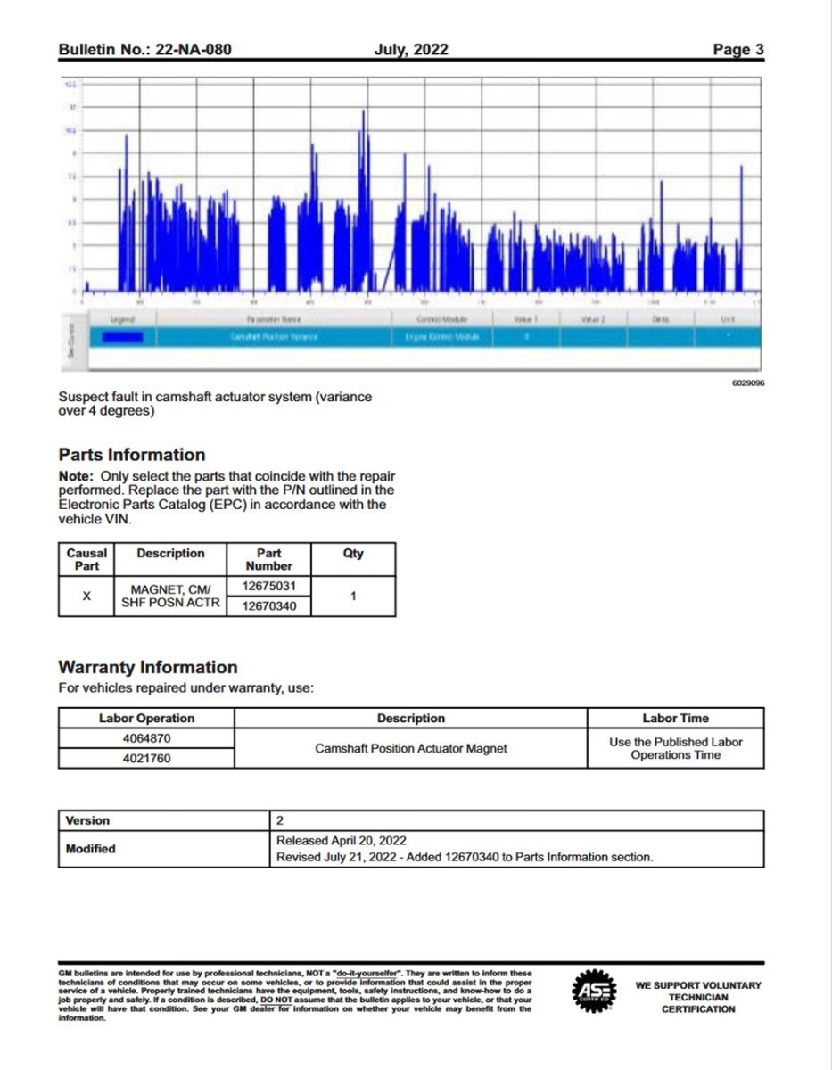 Для поиска проблемы построили диаграмму угла поворота распредвала относительно звезды, посмотрели на результаты, и всё сразу стало понятно. Далее изучили бюллетень ГМ, и оказалось они про эту проблему также знают (22-NA-080), что полностью подтвердило наше предположение.