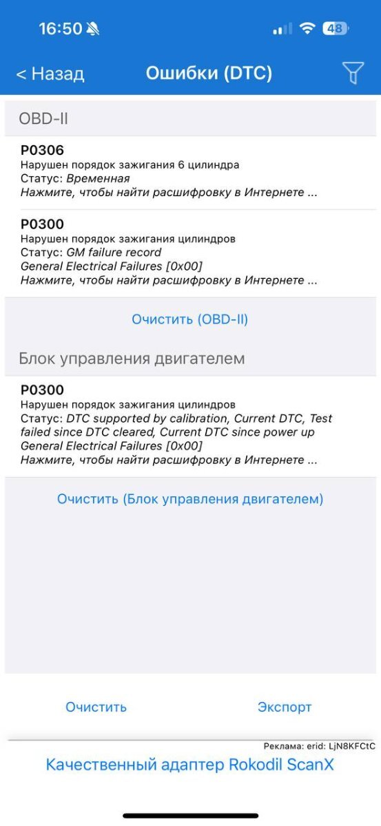 После сборки двигателя стал неустойчиво работать на х.х. особенно после полного прогрева ,  а при резком ускорении , когда обороты двигателя больше 2 000 и времени ускорения больше 3 сек, всплывает мигающий "джеки чан". Мигает минуты две на работающем двигателе на х.х. и ошибка с панели приборов уходит.При считывании обычным (любительским)  ELM OBD сканером, он показывает ошибку P0306 и  P0300 (см.фото) При считывании сканером Lunch 431 Pro видит только ошибку Р0300.